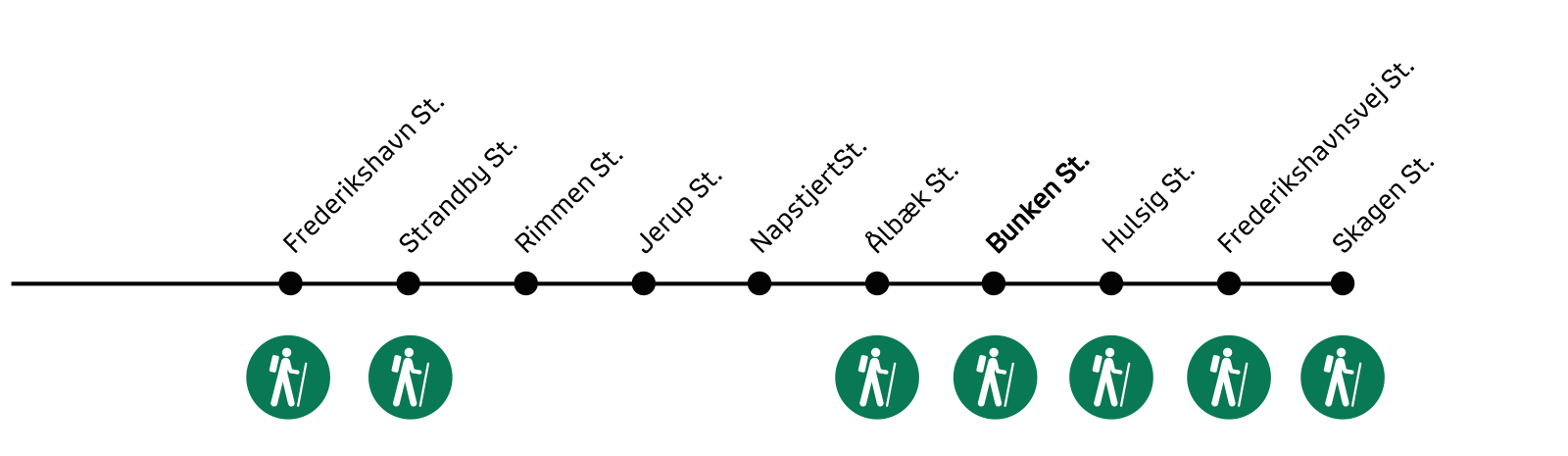 Hop af toget ved Bunken og gå ud på opdagelse i landskabet. Vi har samlet vandreruter til havn, skov og åbne enge – alle med start tæt ved stationen.
