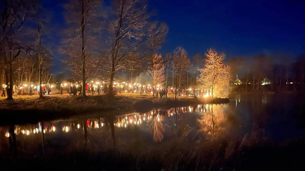 Herefter bevæger deltagerne sig videre ud i landskabet med lys i hænderne, mens mørket, naturen og faklernes skær skaber en helt særlig atmosfære. Undervejs er der fokus på nærvær, fællesskab og på symbolikken i, at vi nu bevæger os mod lysere tider.